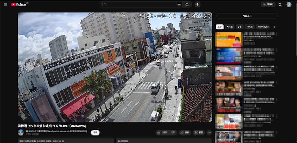 오키나와 나하 국제거리 부근의 cctv를 제공하는 유튜버의 페이지로 연결되고 실시간 표시가 된 영상으로 들어갑니다. 일본 오키나와 나하 국제거리부근의 실시간 cctv를 볼 수 있습니다. 실시간으로 접속한 유저들과 채팅도 재미있어 보입니다.