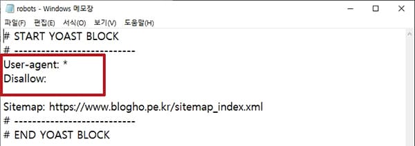 아래가 Yoast SEO(요스트)로 만든 파일입니다. User agent: * Disallow: 라고 되어 있습니다.