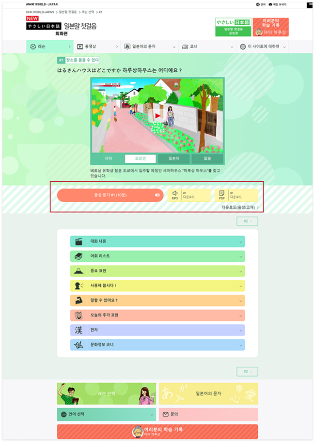 ‘NHK WORLD JAPAN 무료 일본어 강좌’ 는 일본어 공부 PDF 학습자료와 음성파일도 무료도 다운로드할 수 있습니다.