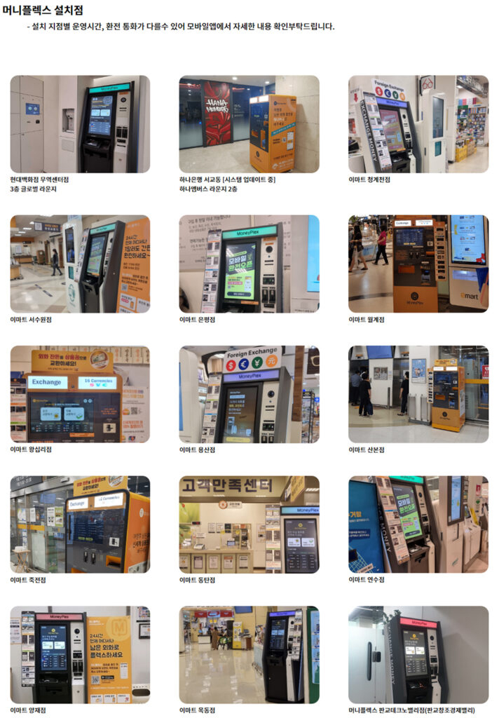 하나은행 서교동지점 하나멤버스 라운지 2층, 이마트 서수원점, 이마트 은평점, 이마트 월계점, 이마트 왕십리점, 이마트 용산점, 이마트 산본점, 이마트 죽전점, 이마트 동탄점, 이마트 연수점, 이마트 양재점, 이마트 목동점, 머니플렉스 판교테크노밸리점(판교창조경제밸리)등