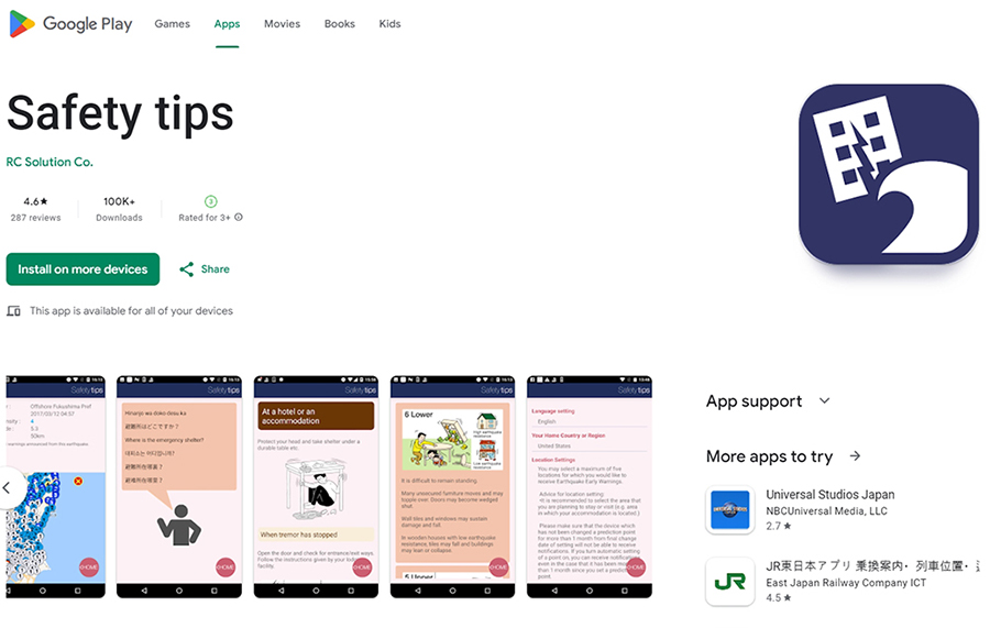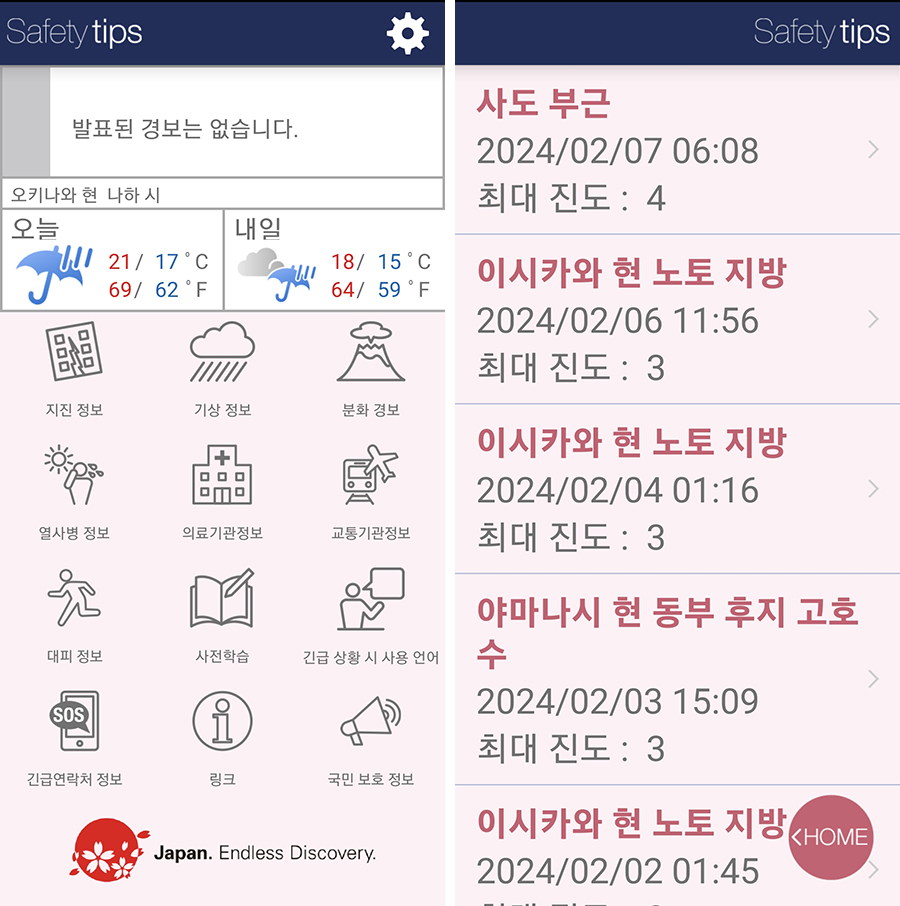 일본여행 지진 및 재난 속보 알림 어플 세이프티 팁스 SAFETY TIPS