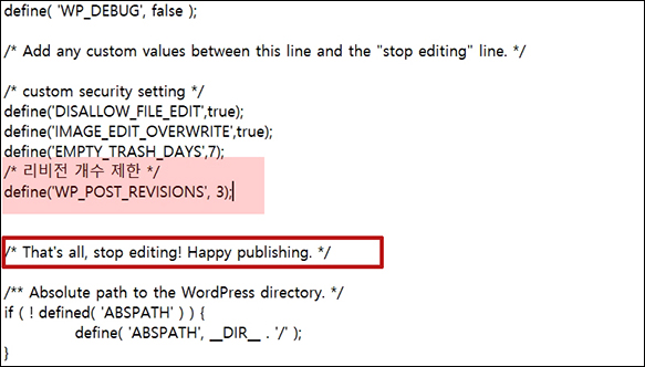 리비전의 기능 중 제어하고 싶은 기능의 위 소스를 FTP 의 wp-config.php 에 삽입하면 됩니다.