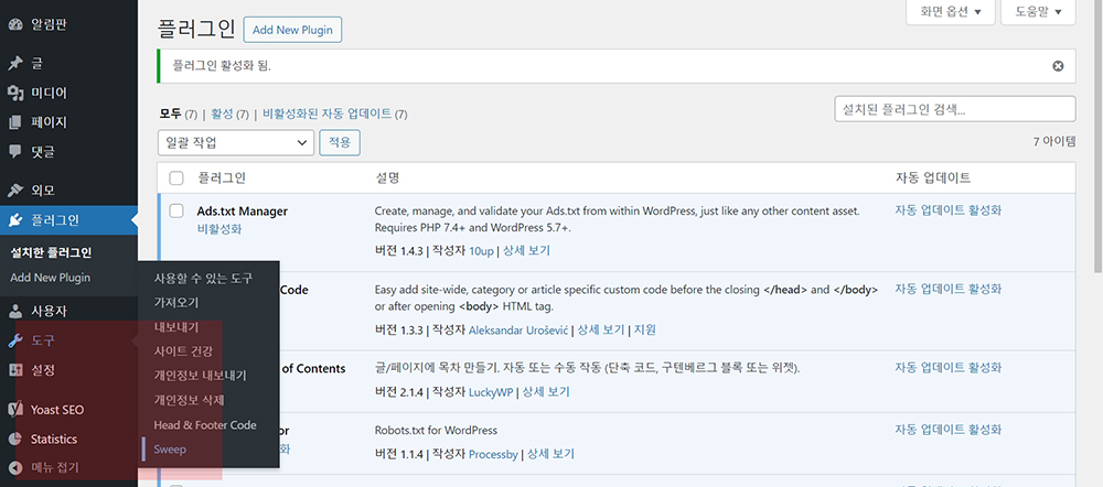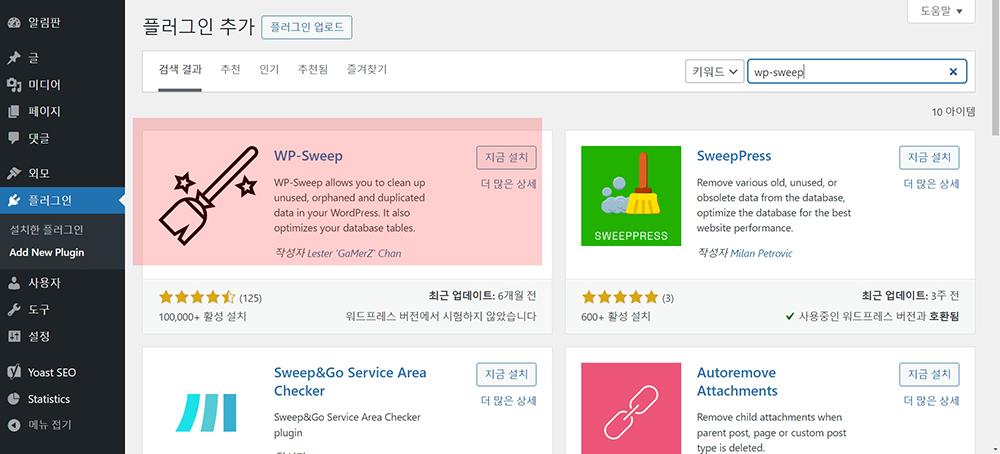 워드프레스 플러그인에서 WP-Sweep 를 다운로드하고 설치합니다.