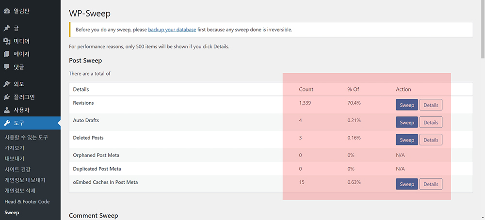 워드프레스 플러그인에서 WP-Sweep 를 다운로드하고 설치합니다.
