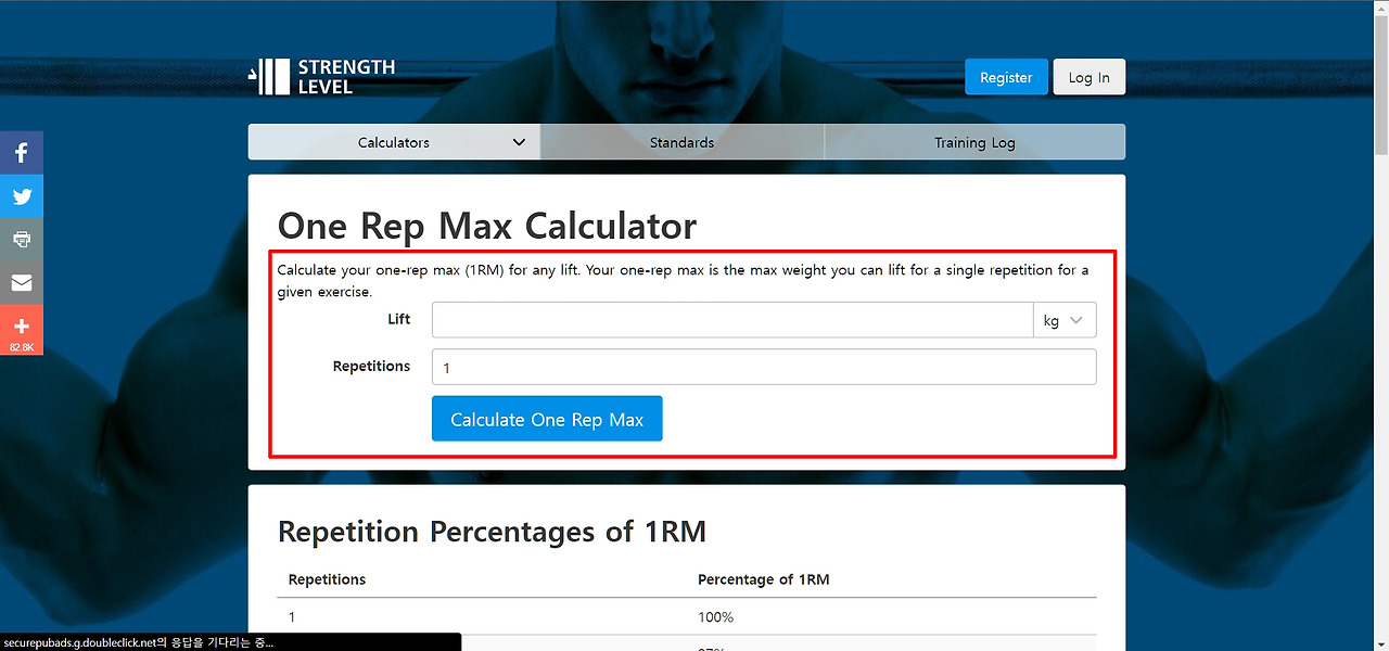 스트렝스 레벨(Stength Level)에서는 웨이트 트레이닝 시 필요한 1RM과 운동별 최대 반복수를 구할 수 있는 1RM계산기를 제공합니다.