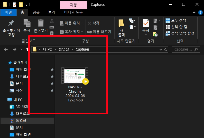 정지를 클릭하면 개임클립 녹화 됨이라는 창이 나오고 클릭하면 아래와 같이 영상이 저장 된 폴더가 열리게 됩니다.