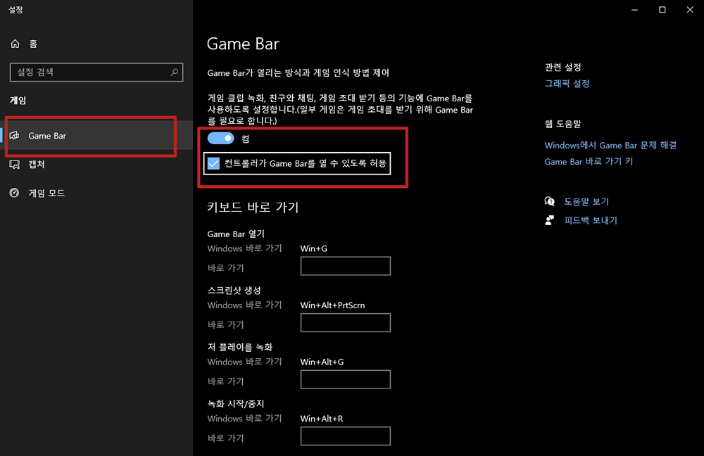 게임 바 (Game Bar)를 켬 으로 컨트롤러가 Game 를 열 수 있도록 허용 의 체크박스를 체크합니다.