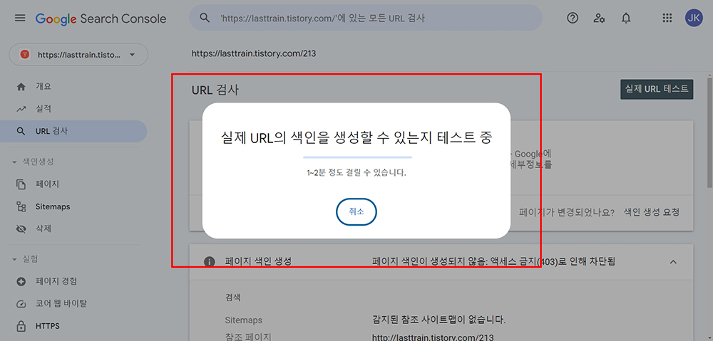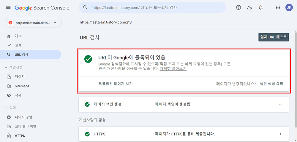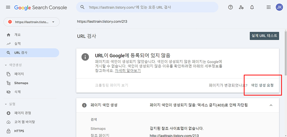 색인 생성 요청을 하면 테스트를 거치고 잠시 후 색인 생성이 요청 됨으로 나옵니다.