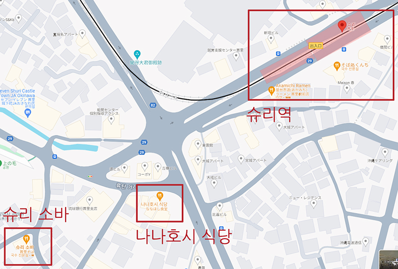 지도를 보면 슈리역에서 나나호시 식당은 걸어서 2~3분거리이고 근처에 유명한 소비 맛집 슈리 소바도 있습니다.