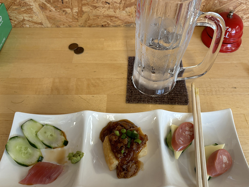 1100엔을 내면 생맥주, 하이볼, 아와모리, 사와등 원하는 술 세잔과 약간의 안주 세 가지가 나옵니다. 안주는 양이 적지만 맛이 있습니다.