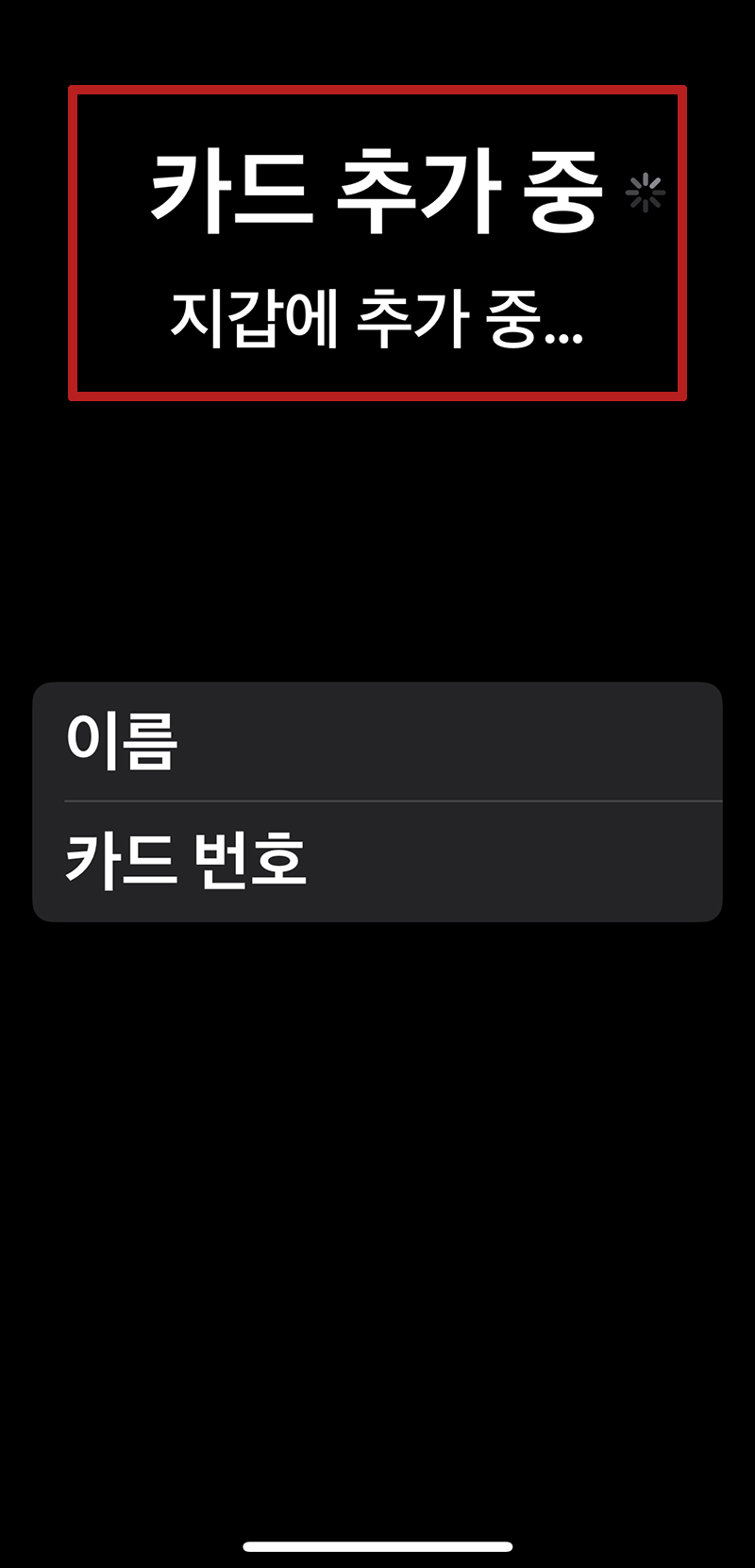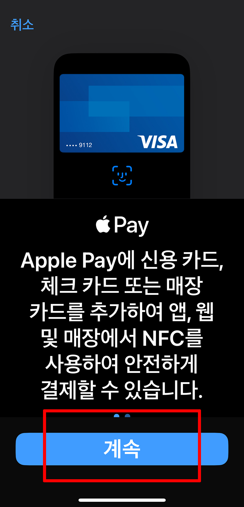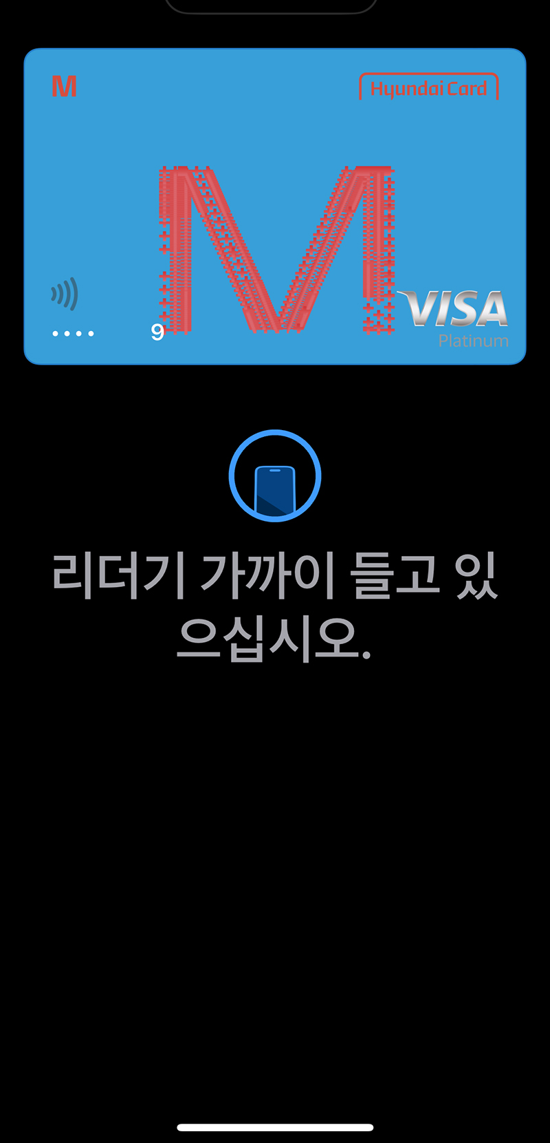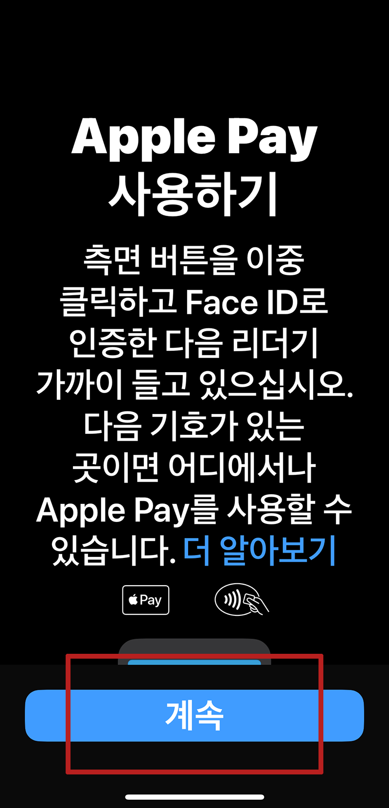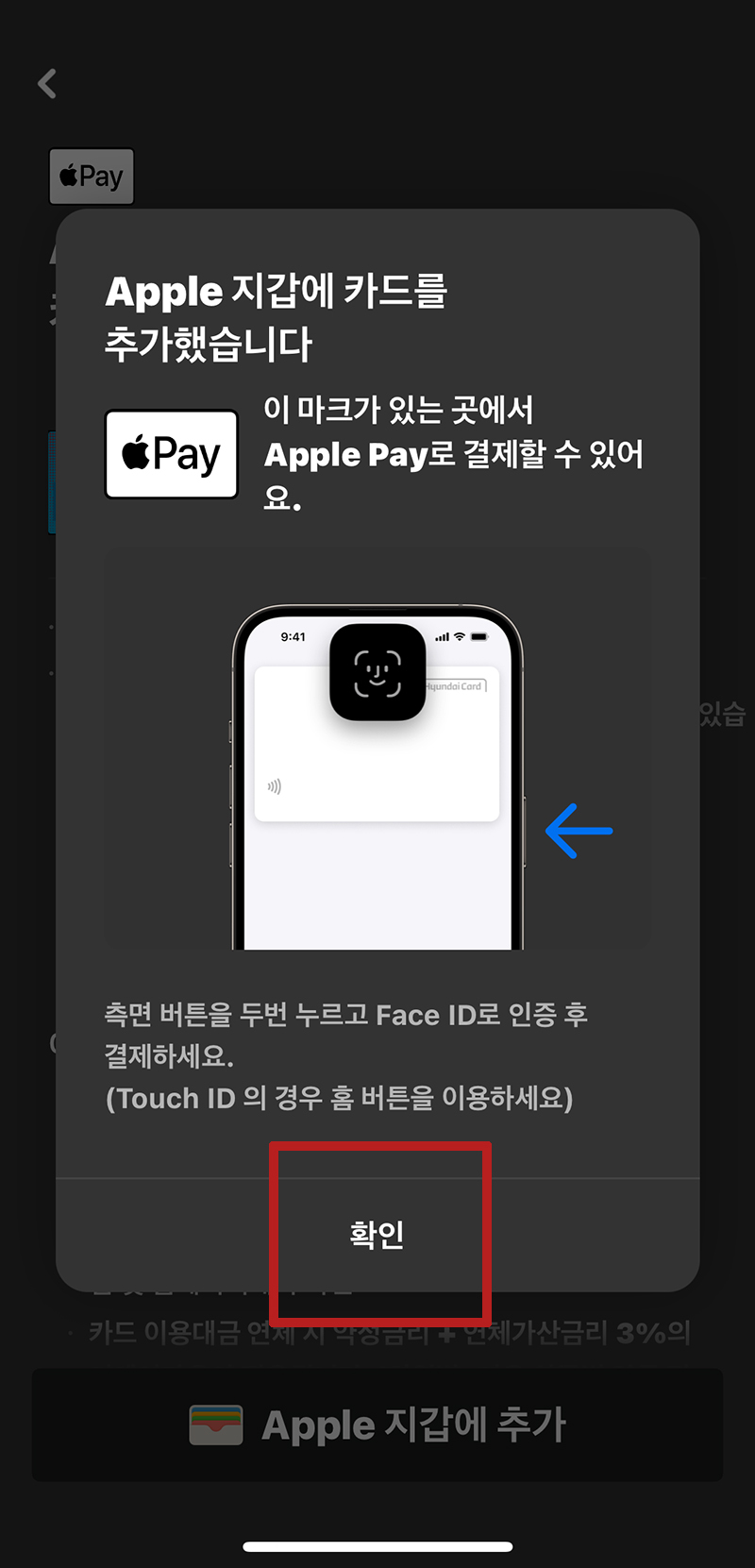 마지막으로 확인을 큭릭하면 Apple 지갑에 카드가 추가가 되고 아래와 같이 애플페이를 사용 할 수 있습니다.