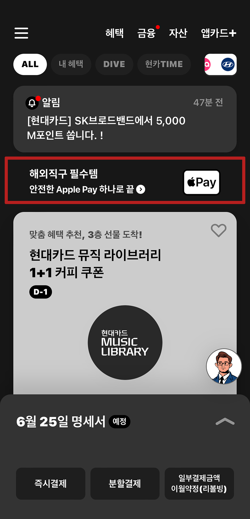 현대카드 앱에 로그인하고 아래와 같이 애플페이 마크가 있는 부분을 클릭합니다.