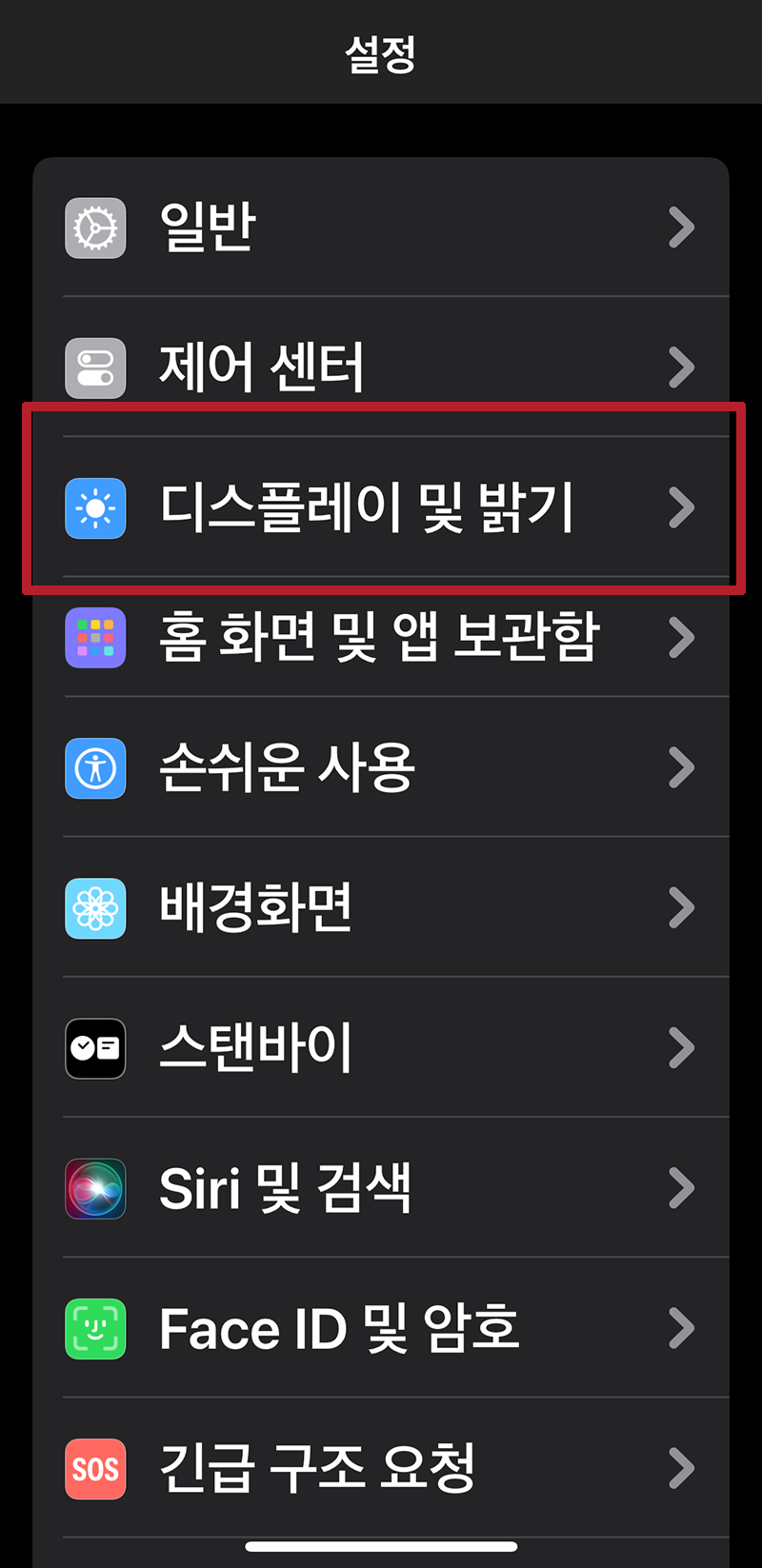 아이폰 설정에서 디스플레이 및 밝기로 들어갑니다.