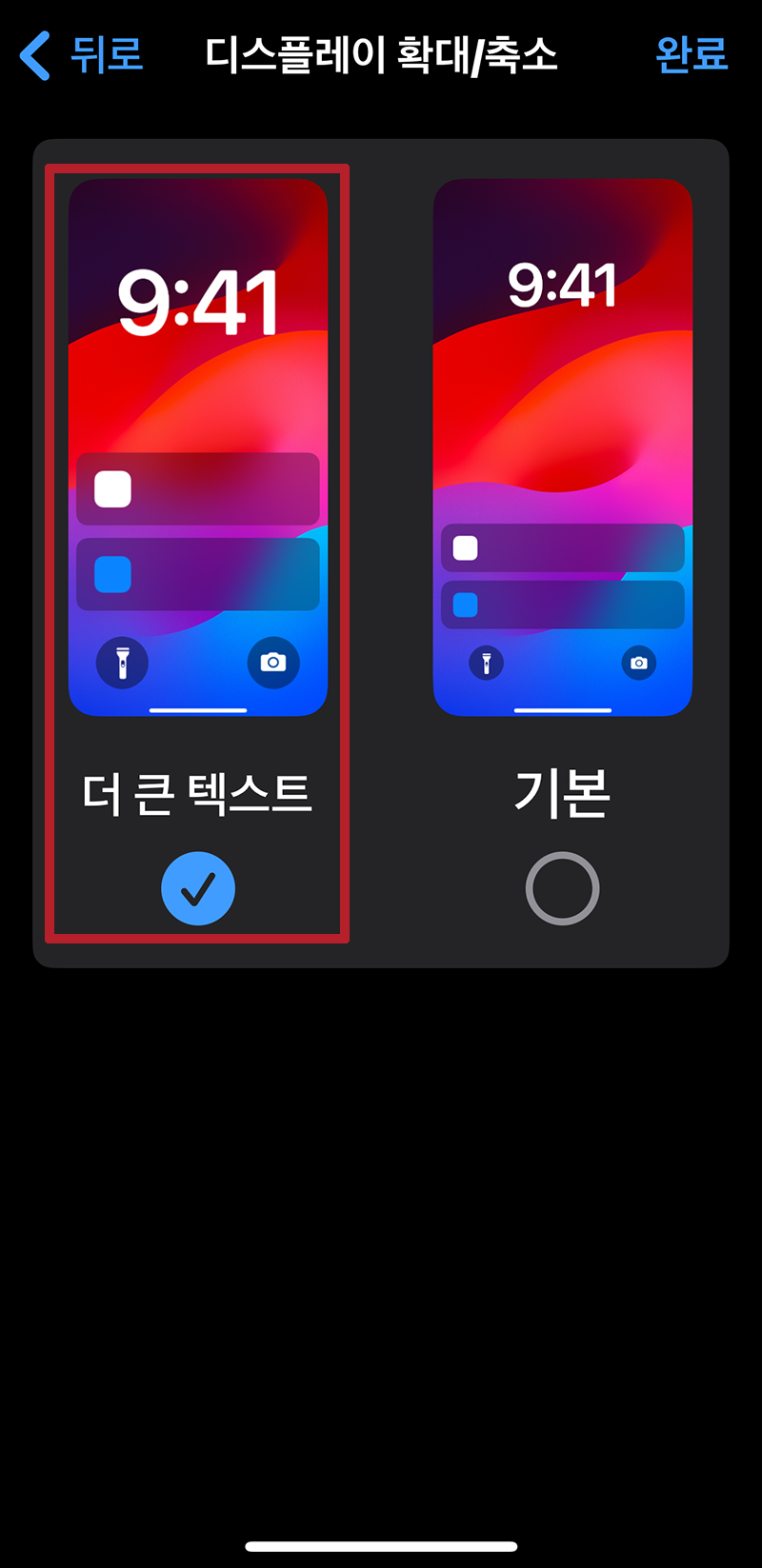 더 큰 텍스트에 체크합니다. 이렇게 하면 어느 정도 아이폰 글씨 크기를 크게 볼 수 있게 됩니다. 하지만 이 정도에 만족이 되지 않는 경우가 있고, 글씨 크기를 설정할 수 없는 특정 어플의 경우 이 기능을 사용해도 글씨 크기가 커지지 않는 경우가 있습니다.