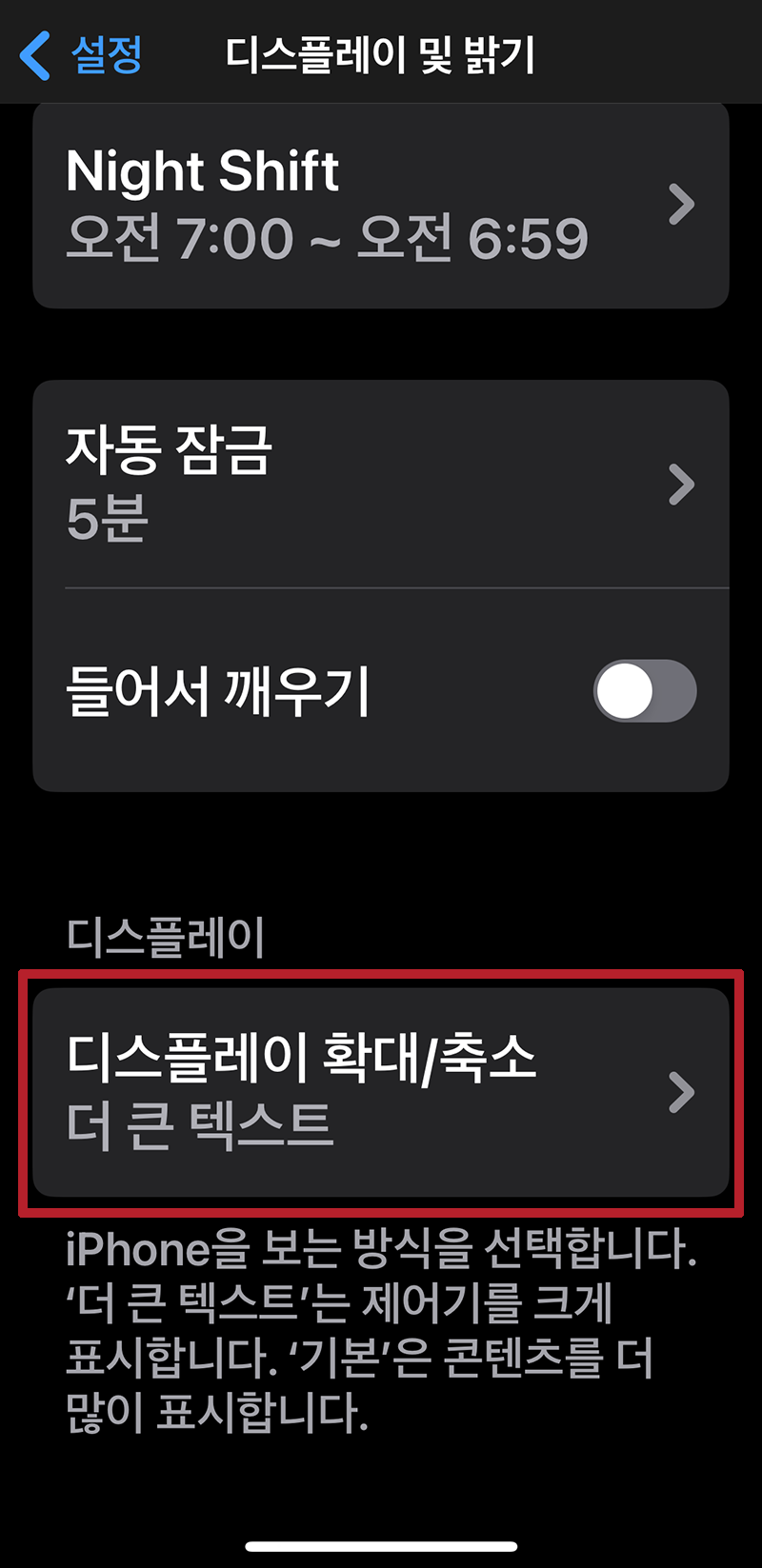 뒤로 돌아와서 아래로 스크롤하면 아래와 같이 디스플레이 확대/축소가 있습니다. 디스플레이 확대 축소로 들어갑니다.