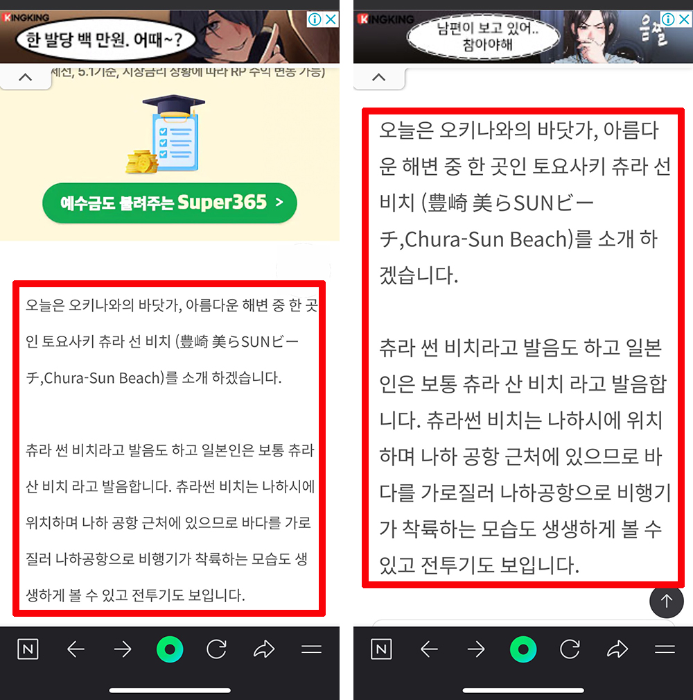 아래는 티스토리 블로그를 모바일에서 볼 때 글씨 크기의 변경 전과 변경 후의 글씨 크기 입니다. 스마트폰을 보면서 작업하시면 됩니다.