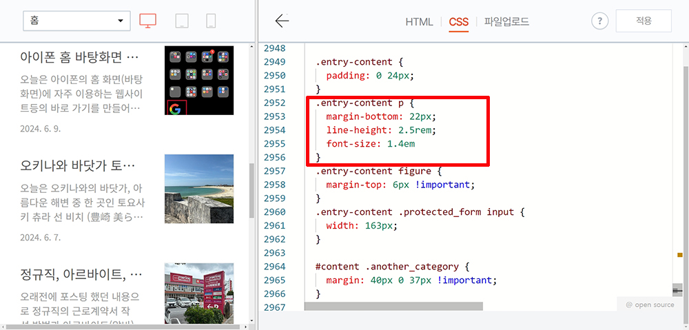 상단의 CSS 를 클릭하고 CSS 로 들어가서 font-size: 1.4em 이라는 부분의 숫자를 변경하면 모바일 글씨 크기를 바꿀 수 있습니다.