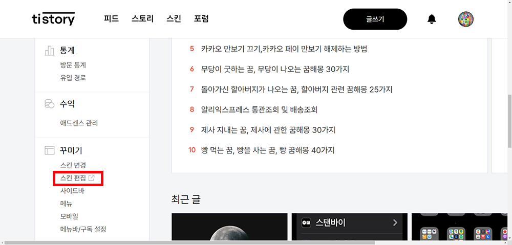 티스토리 관리자 페이지에서 스킨 편집으로 들어갑니다.