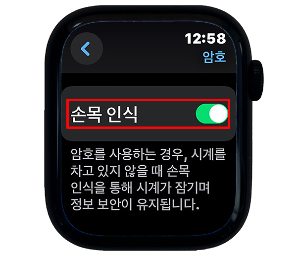 이 기능을 사용하게 되면 '암호를 사용하는 경우, 시계를 차고 있지 않을 때 손목 인식을 통해 시계가 잠기며 보안이 유지됩니다.' 라는 내용이 보입니다.
