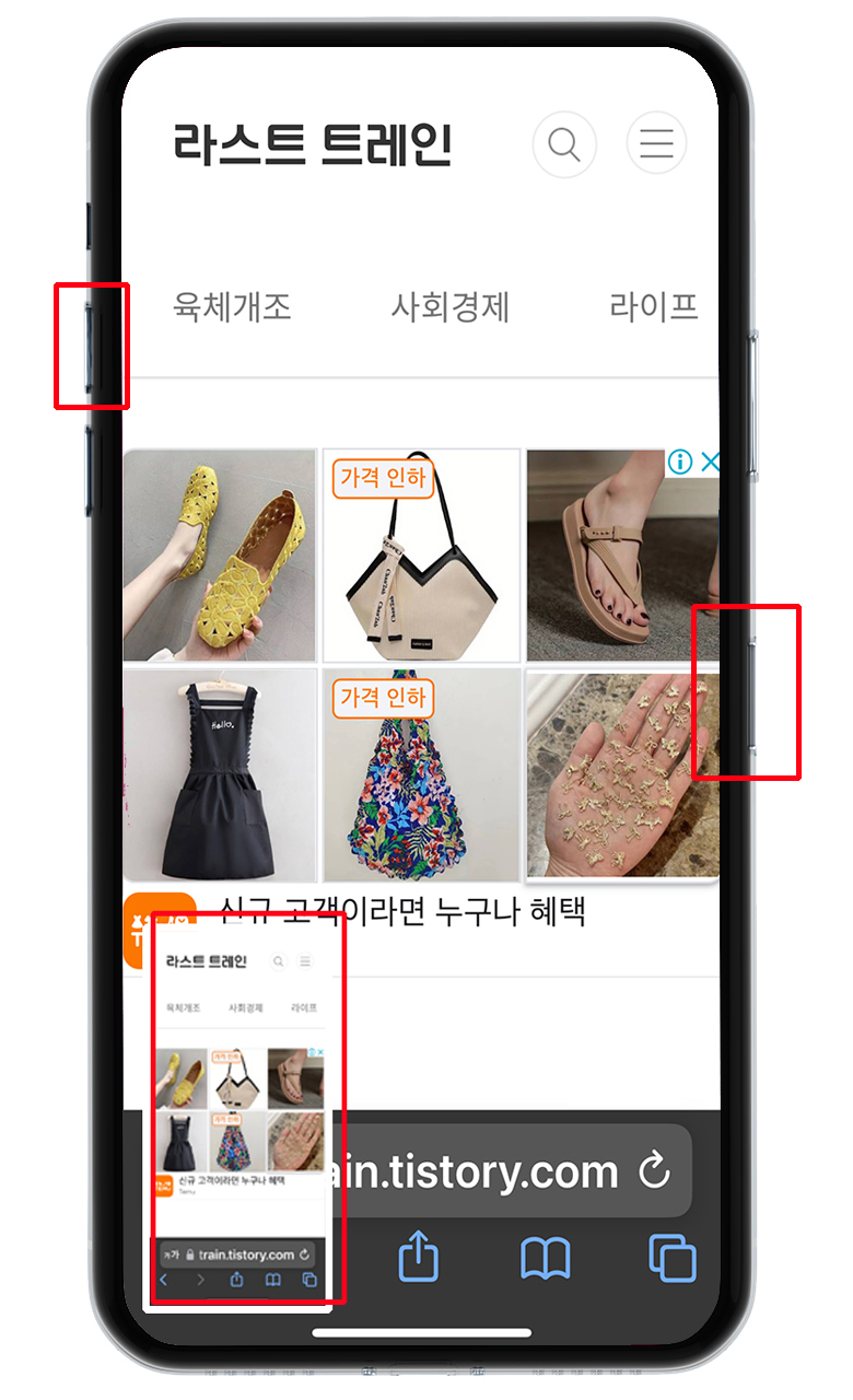 아이폰의 사파리에서 전체화면 스크롤 캡처를 원하는 부분을 오른쪽의 측면 버튼과 왼쪽의 볼륨+ 버튼을 동시에 눌러 호면을 캡쳐 합니다.