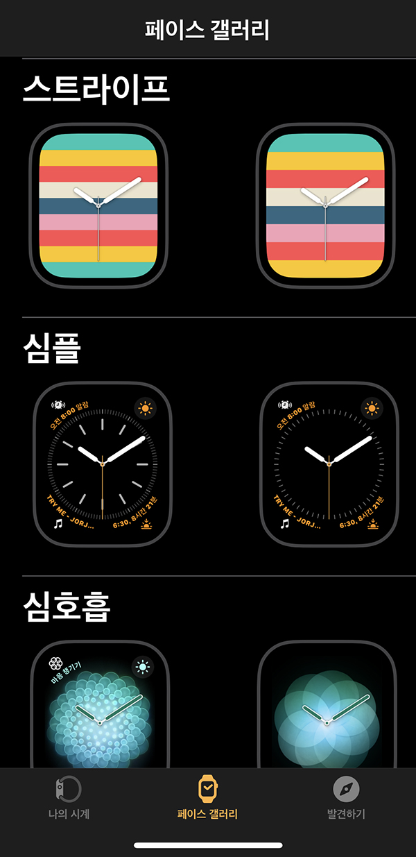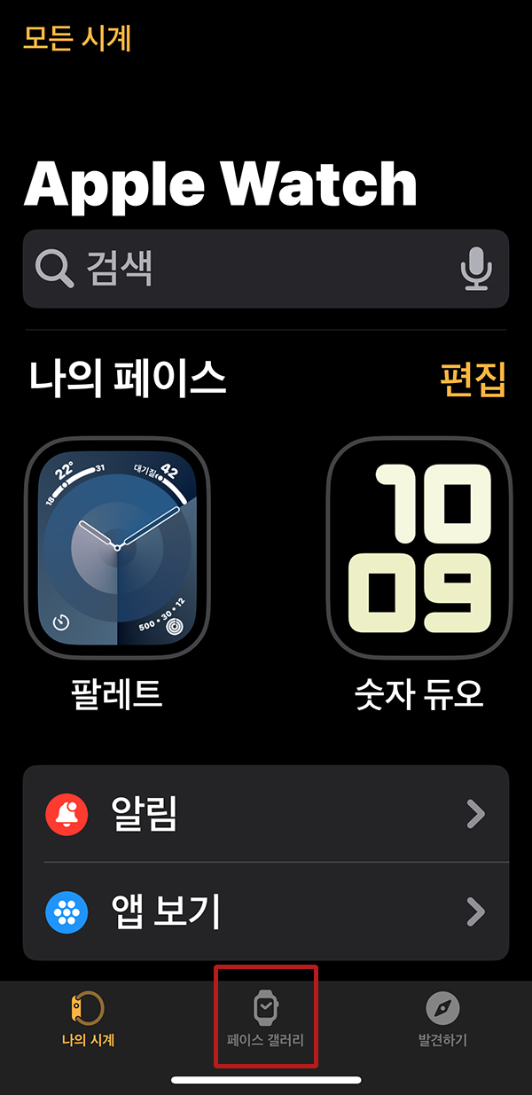 아이폰의 애플워치 앱에 들어가 페이스 갤러리를 터치합니다.