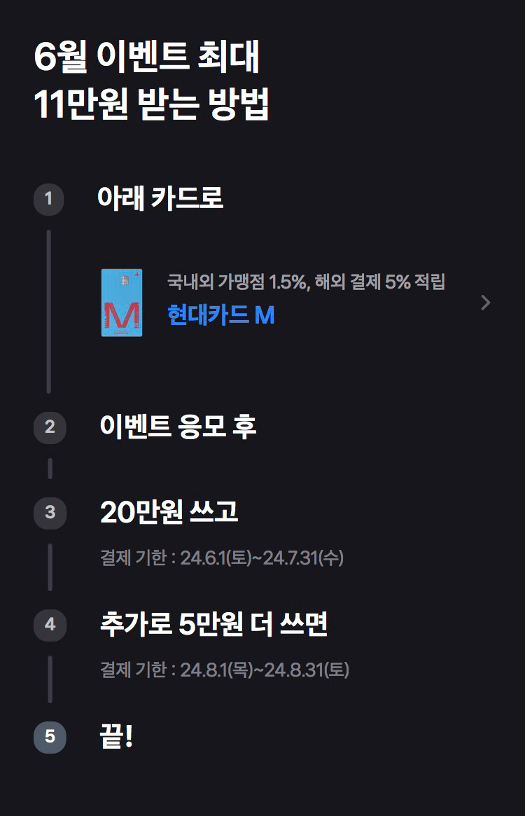 6월 이벤트의 경우 기간동안 20만원 쓰면 24년 8월 말일 경 9만원을 입금 받고 추가로 Apple Pay로 누적 5만원을 쓰면 24년 9월 말일 경 2만원을 입금 받아요.