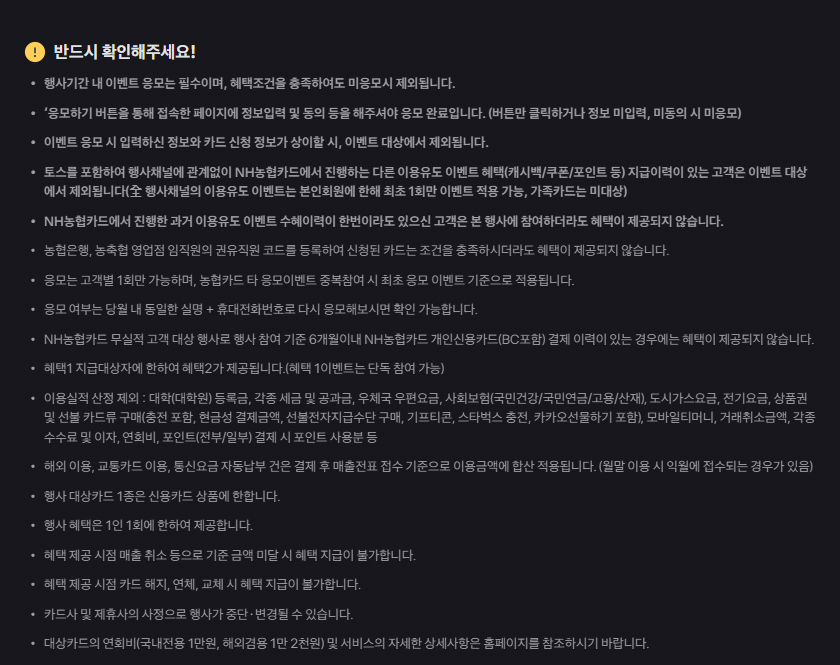 • NH농협카드 무실적 고객 대상 행사로 행사 참여 기준 6개월이내 NH농협카드 개인신용카드(BC포함) 결제 이력이 있는 경우에는 혜택이 제공되지 않습니다.