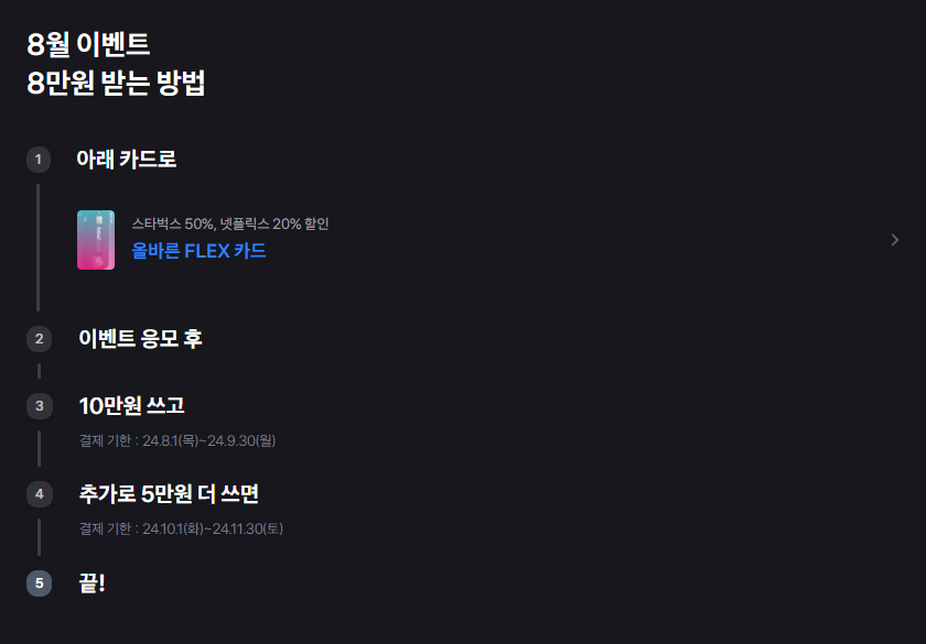 아래 이미지는 카드 이벤트 최대 8만원 받는 방법입니다. 매달 실시하는 것 같으니 이번 달이 지나도 다음 달에 이벤트가 있는지 확인하면 될것같습니다.