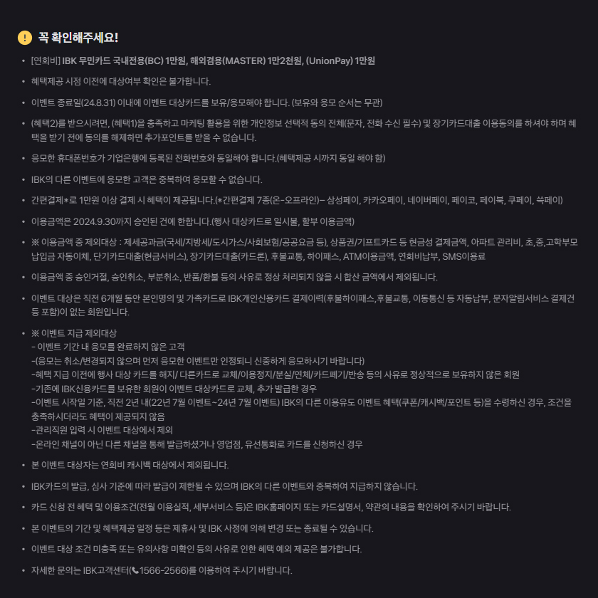 -이벤트 시작일 기준, 직전 2년 내(22년 7월 이벤트~24년 7월 이벤트) IBK의 다른 이용유도 이벤트 혜택(쿠폰/캐시백/포인트 등)을 수령하신 경우, 조건을 충족하시더라도 혜택이 제공되지 않음