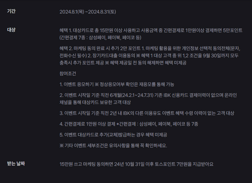 2. 이벤트 시작일 기준 직전 6개월(24.2.1~24.7.31) 기존 IBK 신용카드 결제이력이 없으며 온라인 채널을 통해 대상카드 보유한 고객 대상
