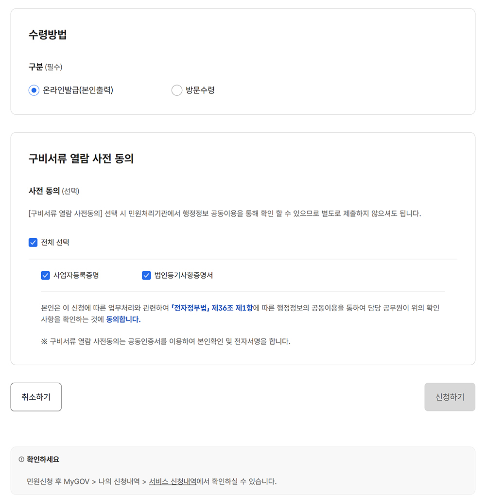 • 통신판매업신고은 민원신청인이 [구비서류 열람 사전동의]를 거치면 민원처리기관에서 행정정보 공동이용을 통해 확인 할 수 있으므로, 별도로 제 출하지 않으셔도 됩니다.