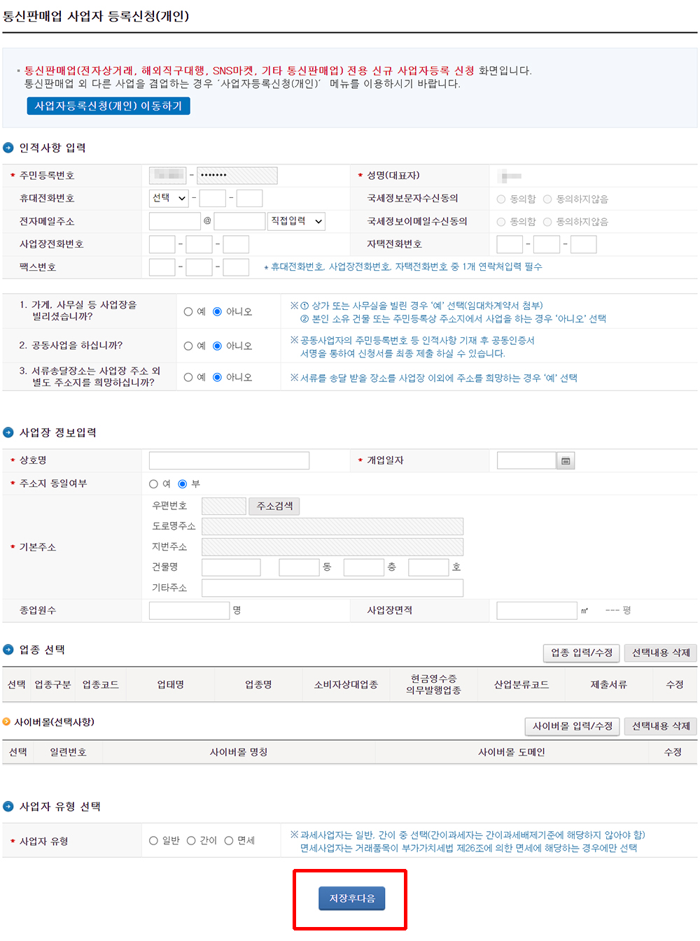 아래와 같은 화면에서 인적사항과 사업장 정보, 업종, 유형등을 기재하고 저장 후 다음으로 넘어가 신청을 마치면 됩니다.
