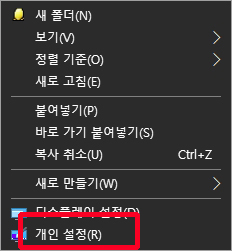 컴퓨터의 바탕화면에서 오른쪽 클릭하여 아래와 같이 개인 설정으로 들어갑니다.