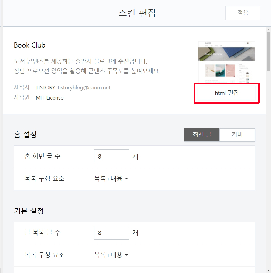 티스토리 관리자 페이지에서 HTML 편집으로 들어갑니다.