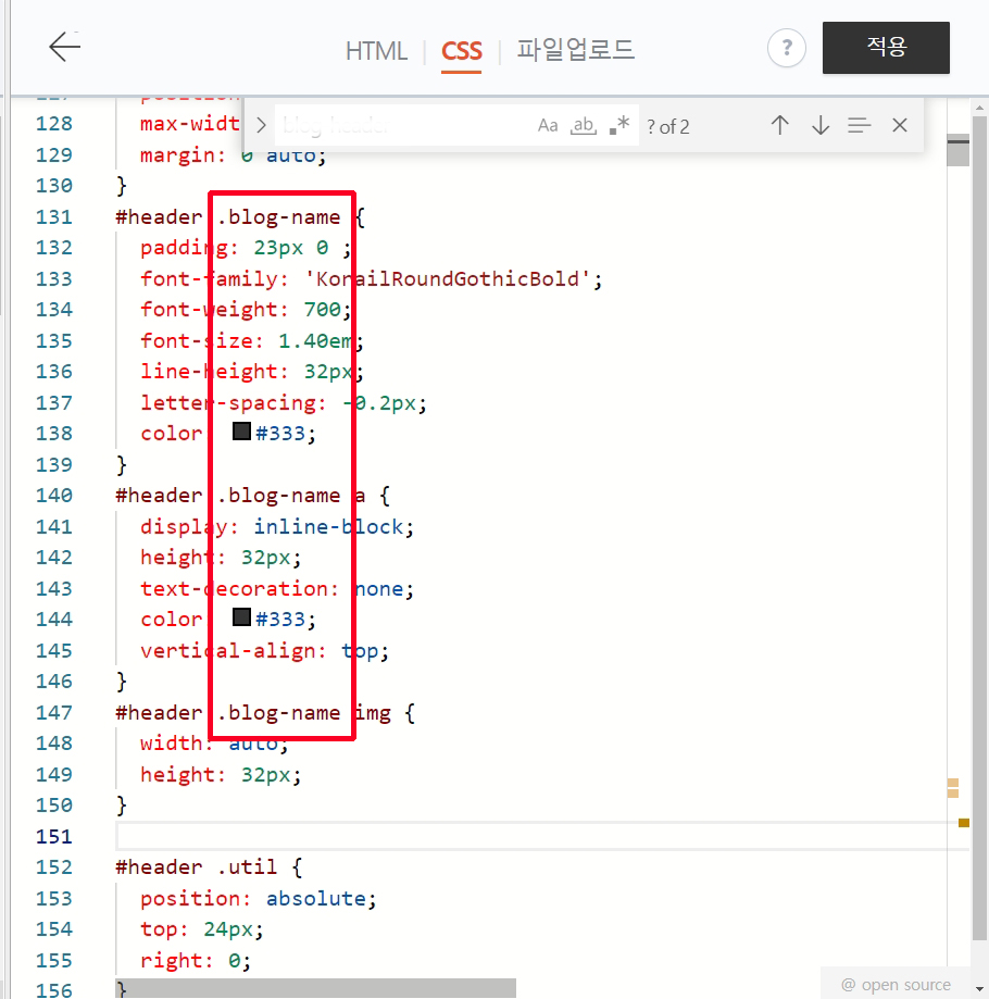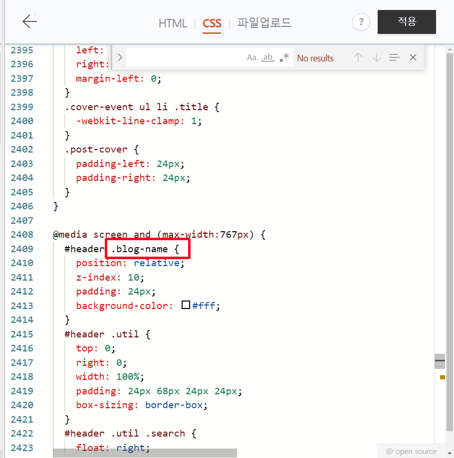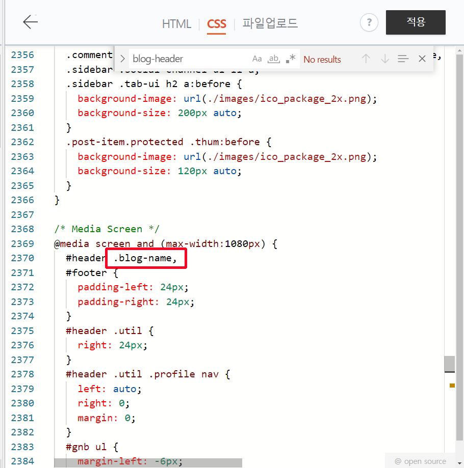 수정하였으면 적용을 누르고 CSS 로 갑니다.