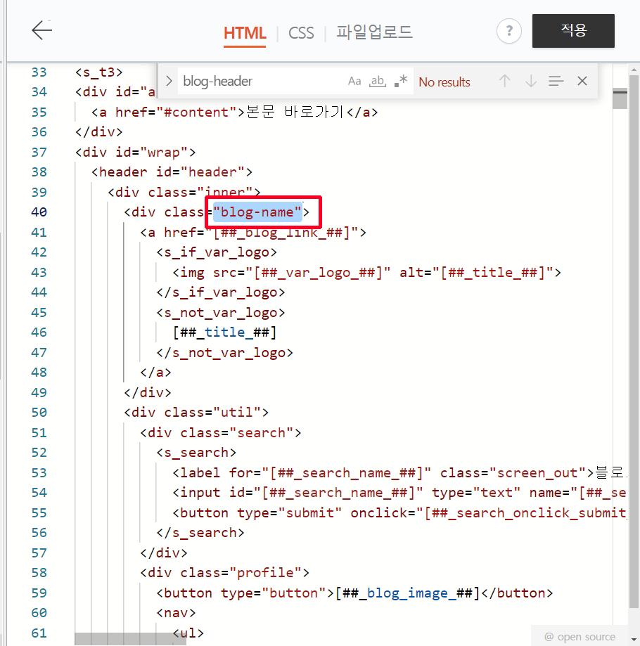 <div class="blog-name"> 와 </div> 로 수정해도 되고 <a> 와 </a> 등 본인이 알아보기 쉽게 하면 됩니다.