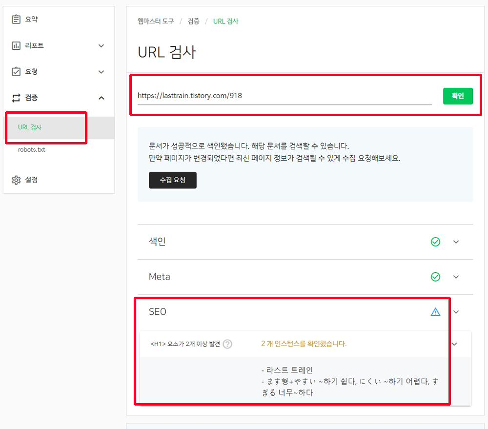 아래와 같이 네이버 웹마스터 도구에서 URL 검사 결과 <H1> 요소가 2개 이상 발견으로 나오고 있습니다. 한 번 해보시기 바랍니다.
