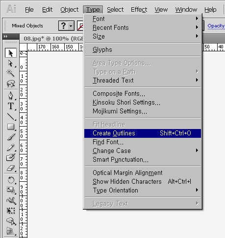 완성된 패스 전체를 드래그하여 선택하고 - Type - Create Oulines 클릭합니다.