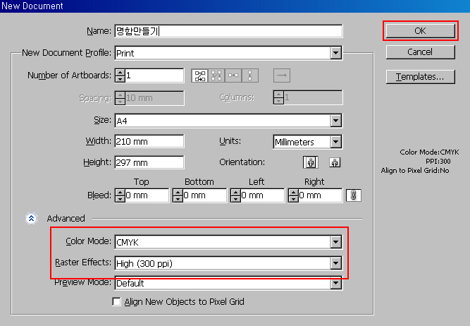 Color Mode : CMYK로 하고 Raster Effects : High (300 ppi)로 설정합니다.