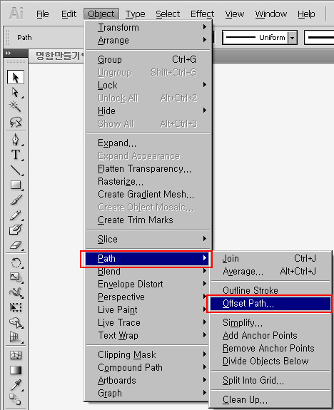 패스 전체를 드래그하여 선택하고 - Object - Path - Offset Path... 클릭합니다.