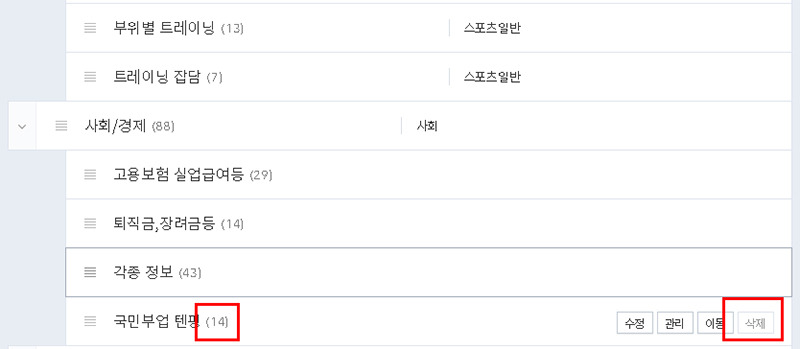 그 다음 삭제할 카테고리를 가보면 삭제 창이 활성화되어 있을 것입니다.