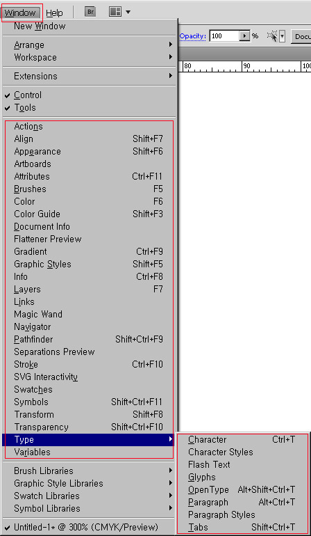 일러스트레이터 화면 상단 메뉴바의 window를 펼치면 각종 패널들이 나열되고 자주 쓰거나 쓰고자 하는 패널을 선택하여 원하는 위치에 정렬한 후 일러스트 작업을 하면 작업의 효율을 높일 수 있습니다.