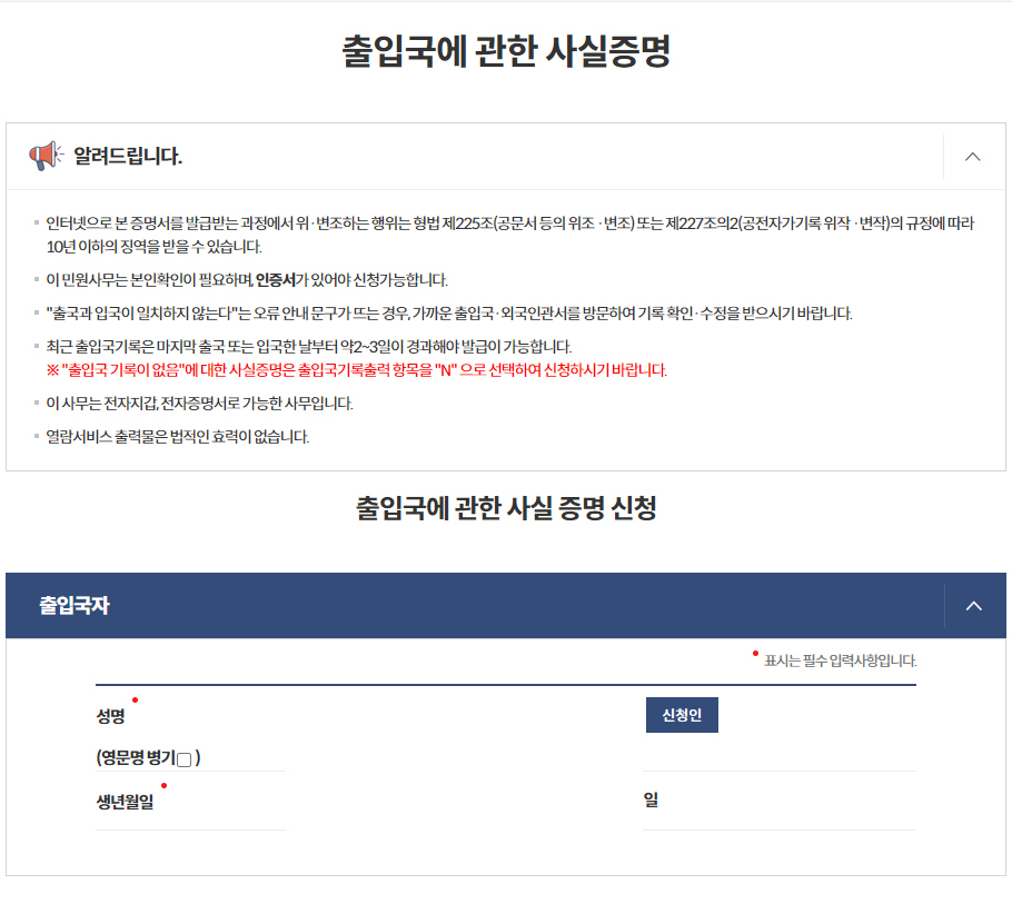 입출국 증명신청 및 조회