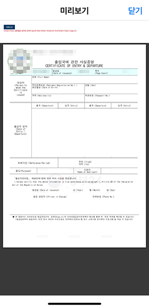 스마트폰으로 발급 받은 출입국에 관한 사실증명의 예시
