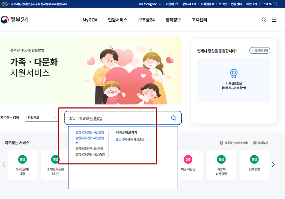 정부24에 접속하여 검색창에 출입국에 관한 사실증명을 검색하고 진입합니다.