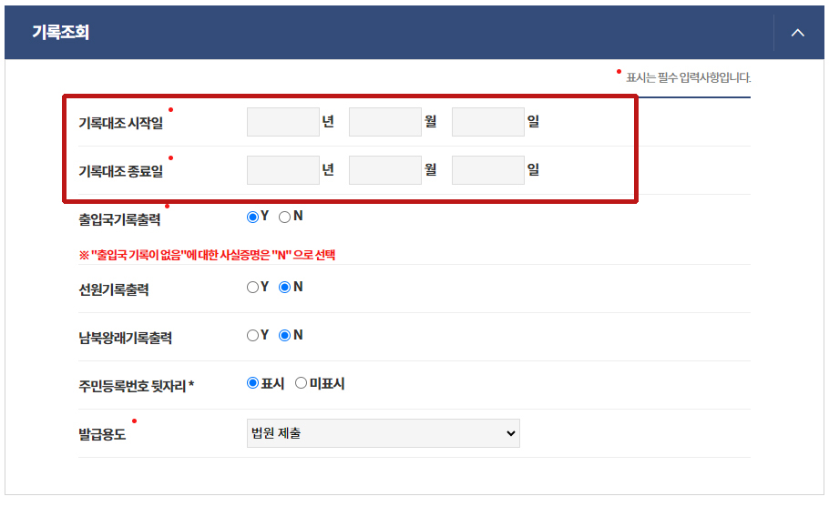 기록대조 시작일은 출입국을 조회하고 싶은 날부터 입력합면되고 모든 내용을 알고 싶다면 생년월일을 입력하면 됩니다.