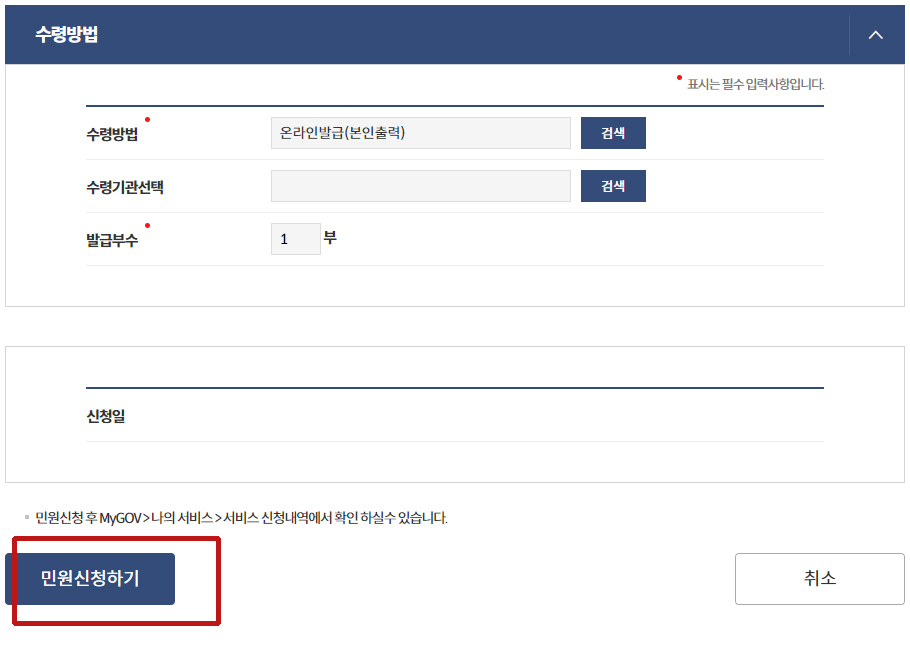 민원신청하기를 누르면 끝입니다.