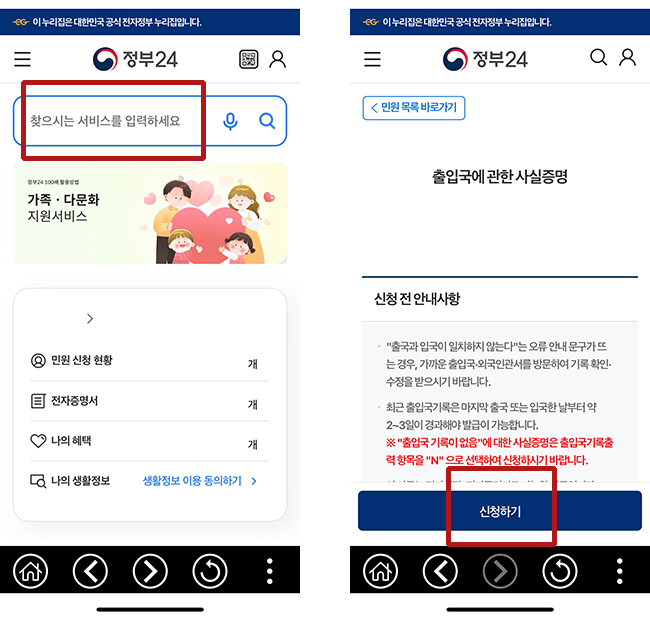 스마트폰에 정부24 어플을 다운로드하고 로그인한 뒤 검색창에 출입국에 관한 사실증명을 입력 후 신청하기를 누릅니다.