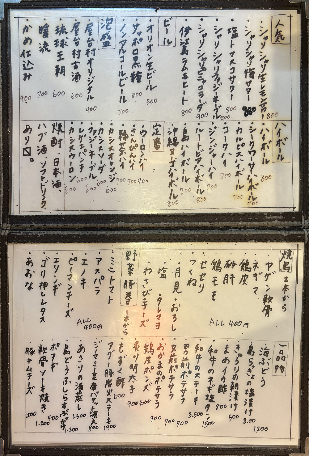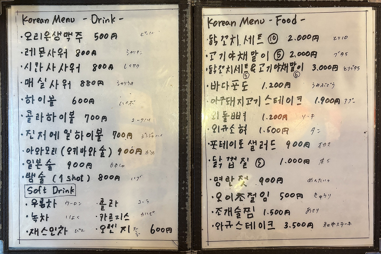 술과 안주류입니다. 한국어 메뉴도 있습니다. 오카나와 전통주 뱀술(하브슈)도 팔고 있으니 꼭 마셔보시기 바랍니다. 오키나와 뱀,하부( ハブ )술은 비아그라와 견줄만하다는 말이 있습니다. 믿거나 말거나.