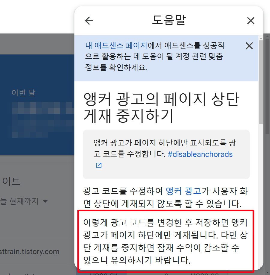 애드센스의 실험에서 앵커 광고는 사용자 화면 상단에 게재될 때 광고 효과가 더 좋은 것으로 나타났으므로 이렇게 광고 코드를 변경한 후 저장하면 앵커 광고가 페이지 하단에만 게재되지만,상단 게재를 중지하면 잠재 수익이 감소할 수 있으니 유의하라고 합니다.